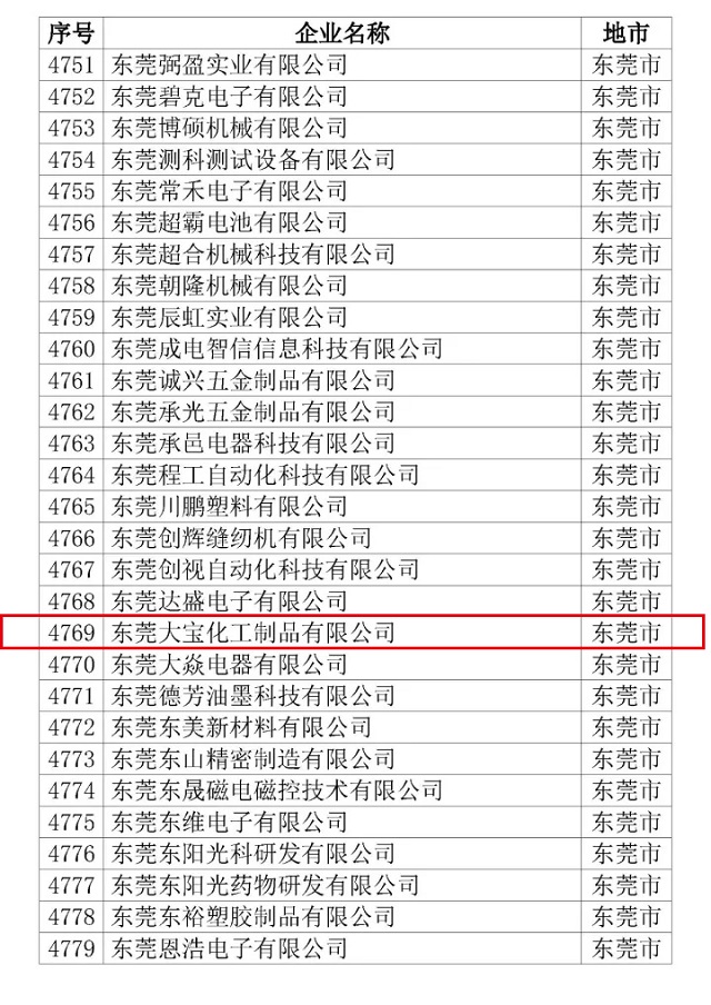12月11日,公示的廣東省2017年第二批擬認(rèn)定國家高新技術(shù)企業(yè)名單,東莞大寶化工再次通過“高新技術(shù)企業(yè)”認(rèn)定,是繼2011年被認(rèn)定為高新技術(shù)企業(yè)后第三次通過認(rèn)定。它不僅標(biāo)志著大寶化工的研發(fā)創(chuàng)新工作邁上新的臺階,也表明大寶化工的自主研發(fā)能力和創(chuàng)新能力均在涂料行業(yè)中處于前列!