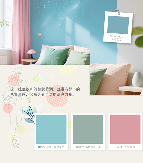 在春夏交替的時(shí)節(jié),色彩是最快改變空間氛圍的利器。2025年度大寶推薦色B4322-64T藍(lán)色星空,靈感來(lái)源于捕捉了破曉時(shí)分的澄澈與日暮時(shí)分的溫柔。淺藍(lán)的輕盈中糅入一絲綠意,如同晨光微熹時(shí)的天幕,又似暮色四合前的遠(yuǎn)山。